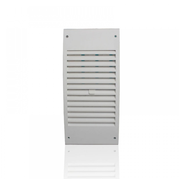 Решетка применяется для декорирования выходов систем вентиляции, оборудована защитной сеткой и наклонными жалюзи.